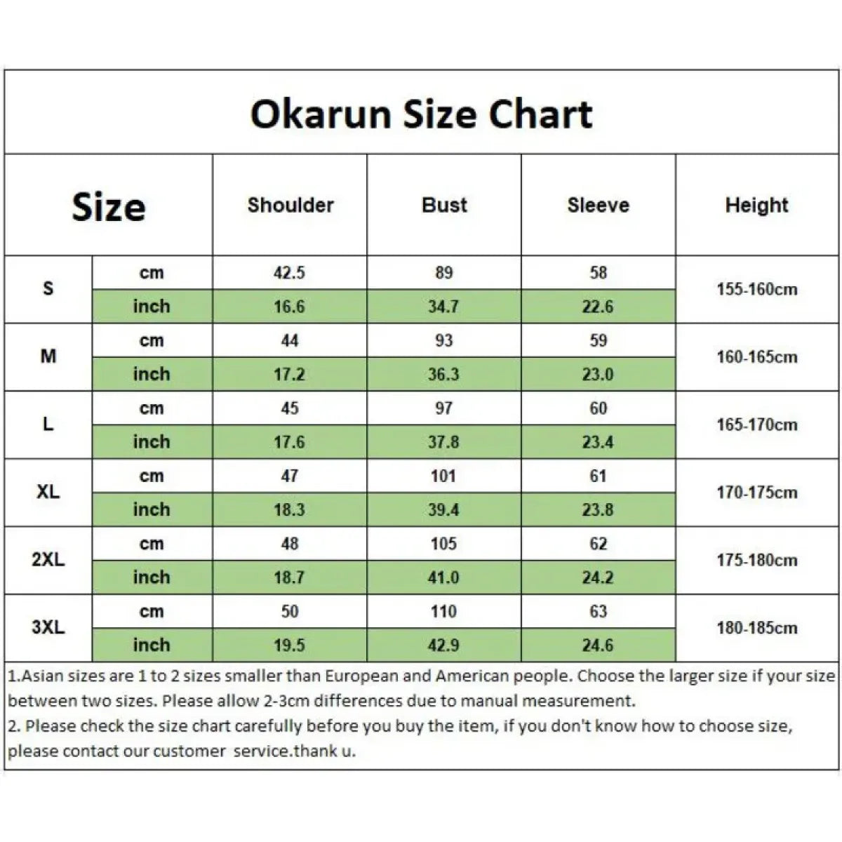 | Size | Shoulder (cm) | Bust (cm) | Sleeve (cm) | Height (cm) |