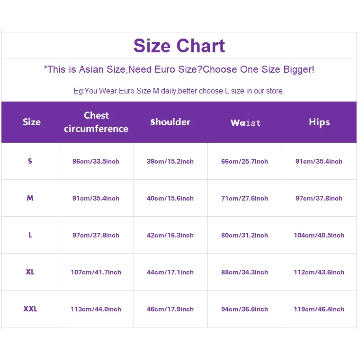 | Size | Bust (cm/in) | Shoulder (cm/in) | Waist (cm/in) | Hips (cm/in) |